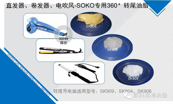 SVKV索科轉尾油脂專為直發器/卷發器360度無死角長效應用,有效減少磨損,對塑膠及貴金屬無化學反應,SVKV索科專用轉尾油脂SK909 和SK908系列/電源線轉動部位接點潤滑油廣泛應用于各大國際知名品牌廠的直發器、自動卷發神器中。
