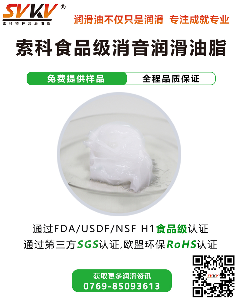 索科SVKV食品級消音潤滑油脂選用食品級的基礎(chǔ)油和無毒無害的添加劑精制而成,專為食品加工及醫(yī)療設(shè)備而研制。索科食品級消音潤滑脂針對苛刻的工作環(huán)境能有效降低噪音,減少機(jī)械磨損、延長其壽命并降低維護(hù)頻率。