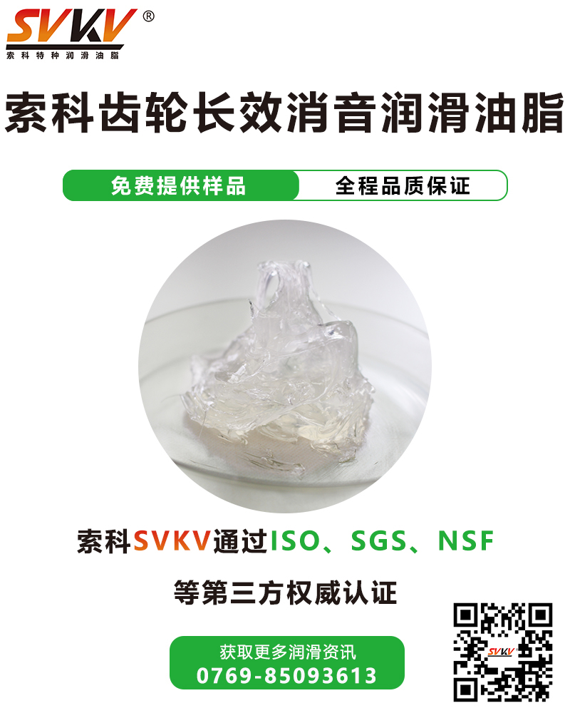 廣東索科潤滑油有限公司是一家致力于裝配產品使用特種潤滑脂的研發、生產、定制、服務為一體的專業性石化企業。致力為制造業客戶,提供專業的選油方案,協助客戶解決產品裝配時的潤滑難題,還可根據客戶特殊需求訂做適合的潤滑油品。有效提高產品性能、減低維護成本,索科助力制造業高端化發展! 主要產品有: 齒輪消音潤滑脂|高溫潤滑脂|食品級潤滑脂|齒輪消音潤滑脂|防水潤滑脂 導電油脂|軸承油|硅油|干性皮膜潤滑劑|低溫潤滑脂|阻尼脂|全氟油脂