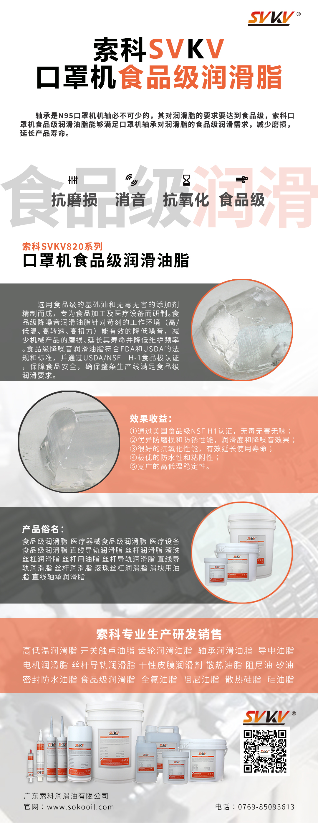 索科為企業提供潤滑方案,降本增效,適合的潤滑油脂能有效減少磨損,延長產品壽命。索科提供口罩機食品級潤滑油脂0769-85093613免費樣品,全程品質保證!